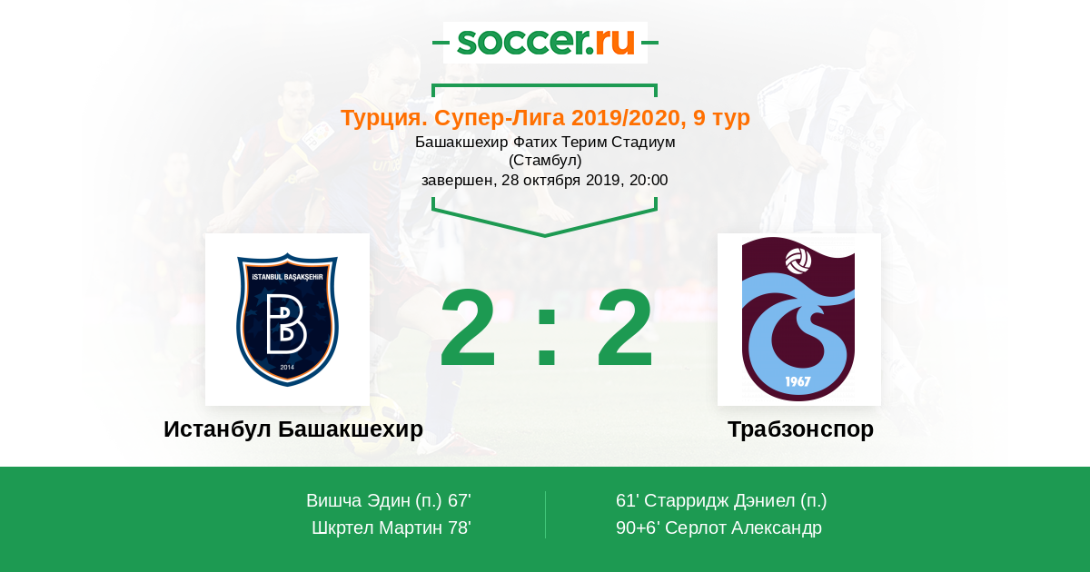 Турция. Суперлига 17.10.2020 Трабзонспор Логотип футбольный клуб Трабзонспор 0:2 Логотип футбольный клуб Истанбул Башакшехир (Стамбул) Истанбул Башакшехир