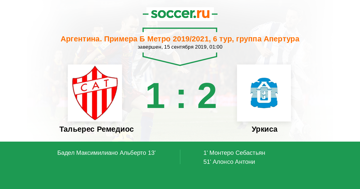 Аргентина. Примера Б Метро 20.06.2022 Тальерес Ремедиос Логотип футбольный клуб Тальерес Ремедиос 1:0 Логотип футбольный клуб Уркиса (Касерос) Уркиса