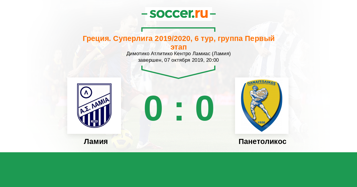Греция. Суперлига 19.10.2020 Ламия Логотип футбольный клуб Ламия 0:0 Логотип футбольный клуб Панетоликос (Агринио) Панетоликос