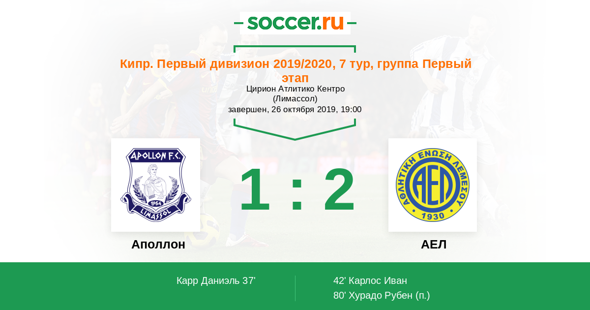 Кипр. Первый Дивизион 29.11.2020 Аполлон Логотип футбольный клуб Аполлон (Лимассол) 1:2 Логотип футбольный клуб АЕЛ (Лимасcол) АЕЛ