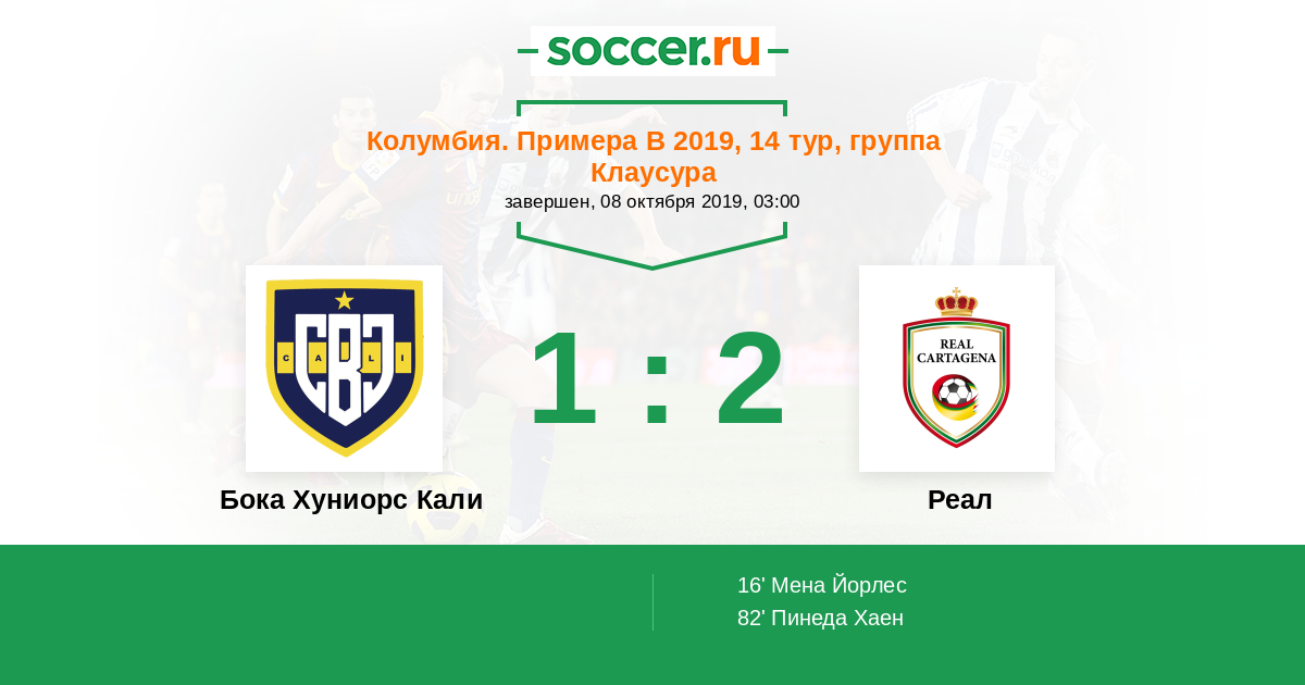 Колумбия. Примера B 28.04.2019 Реал Логотип футбольный клуб Реал (Картахена) 1:0 Логотип футбольный клуб Бока Хуниорс Кали (Сантьяго-де-Кали) Бока Хуниорс Кали