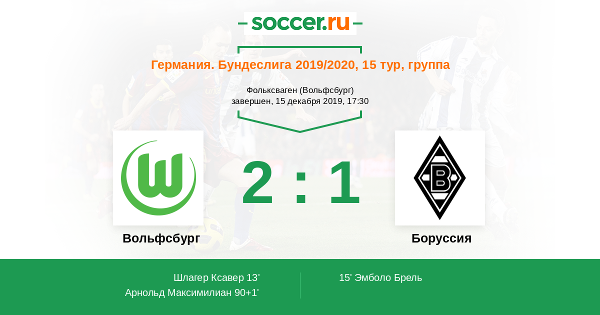 Германия. Бундеслига 20.12.2016 Боруссия Логотип футбольный клуб Боруссия (Менхенгладбах) 1:2 Логотип футбольный клуб Вольфсбург Вольфсбург