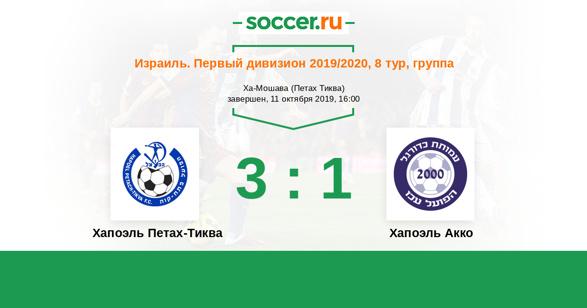Израиль. Первый дивизион 01.03.2019 Хапоэль Акко Логотип футбольный клуб Хапоэль Акко 1:2 Логотип футбольный клуб Хапоэль Петах-Тиква Хапоэль Петах-Тиква