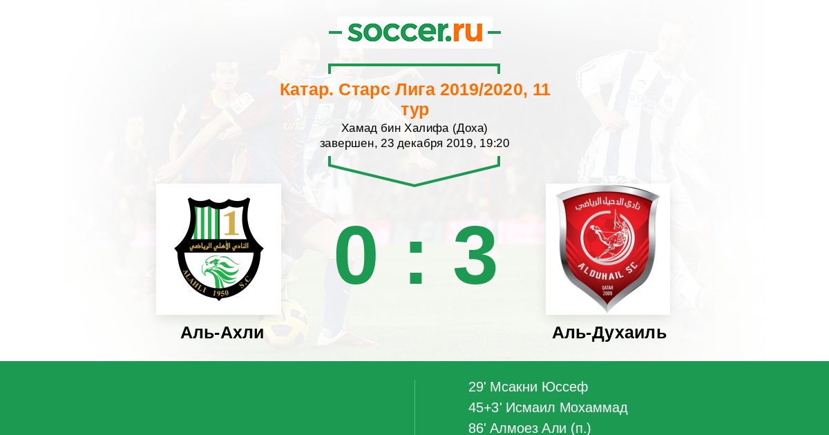 Катар. Старс Лига 27.12.2020 Аль-Ахли Логотип футбольный клуб Аль-Ахли (Доха) 3:5 Логотип футбольный клуб Аль-Духаиль (Доха) Аль-Духаиль