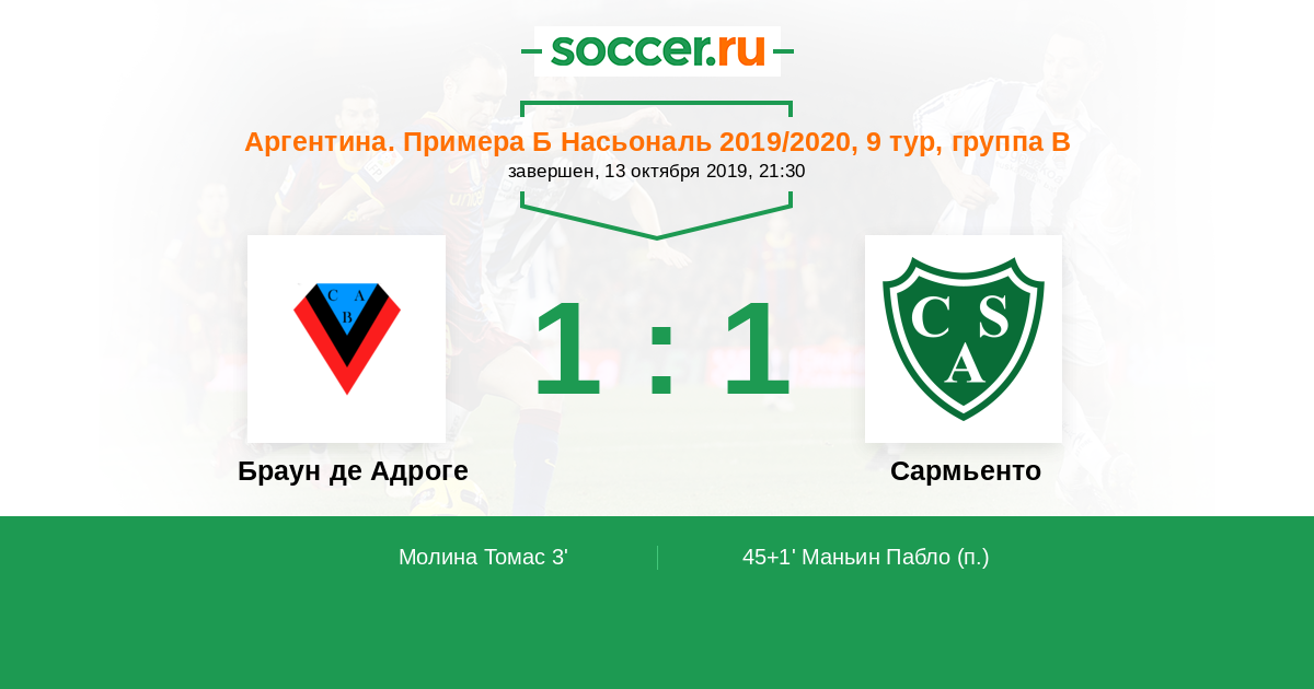 Аргентина. Примера Б Насьональ 13.05.2018 Сармьенто Логотип футбольный клуб Сармьенто (Хунин) 1:1 Логотип футбольный клуб Браун де Адроге Браун де Адроге