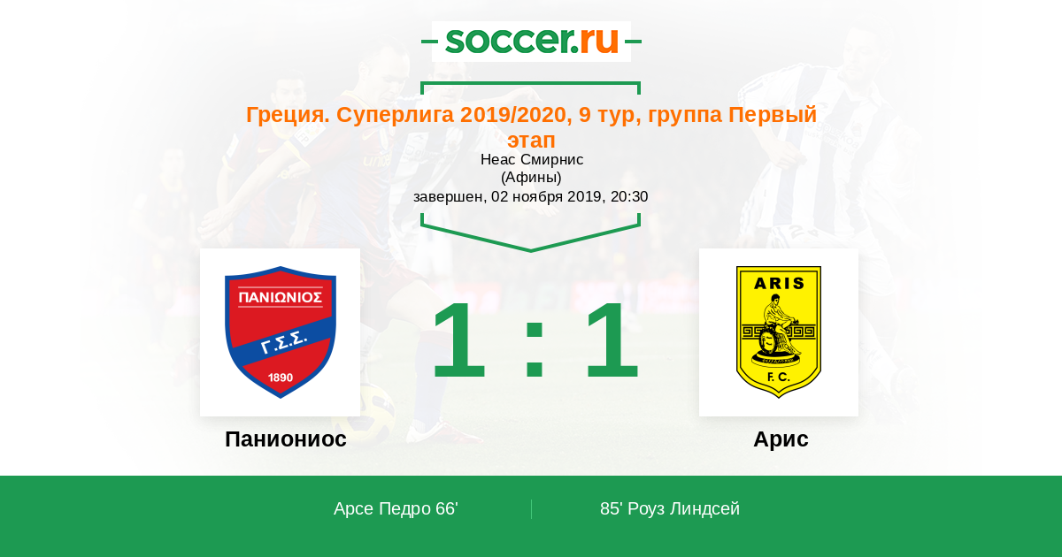 Греция. Суперлига 06.10.2018 Паниониос Логотип футбольный клуб Паниониос (Афины) 1:0 Логотип футбольный клуб Арис (Салоники) Арис