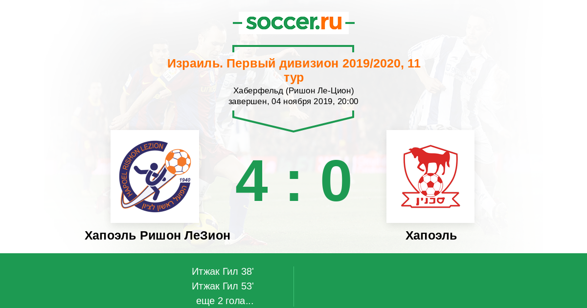 Израиль. Первый дивизион 12.04.2019 Хапоэль Логотип Хапоэль (Бней Лод) 4:1 Логотип футбольный клуб Хапоэль Ришон ЛеЗион Хапоэль Ришон ЛеЗион