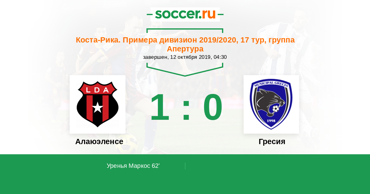 Коста-Рика. Примера дивизион 01.10.2017 Алаюэленсе Логотип футбольный клуб Алаюэленсе (Алаюэла) 3:0 Логотип футбольный клуб Гресия Гресия
