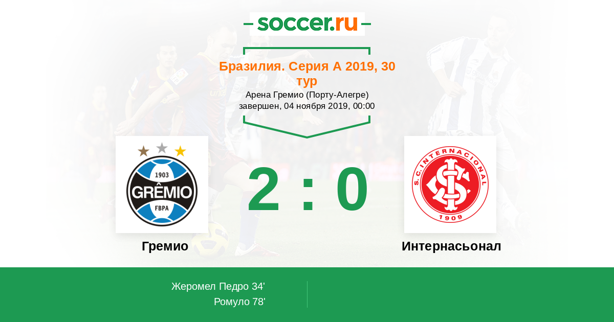 Бразилия. Серия А 09.09.2018 Интернасьонал Логотип футбольный клуб Интернасьонал (Порту-Алегри) 1:0 Логотип футбольный клуб Гремио (Порту-Алегри) Гремио