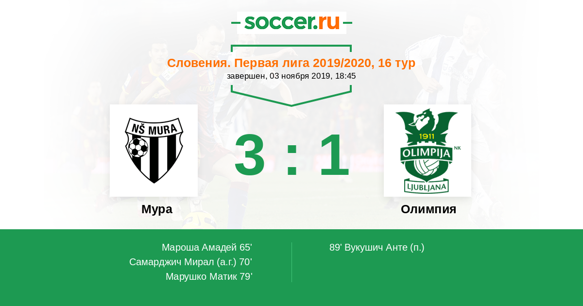 Словения. Первая Лига 24.08.2019 Олимпия Логотип футбольный клуб Олимпия (Любляна) 1:1 Логотип футбольный клуб Мура (Мурска Собота) Мура