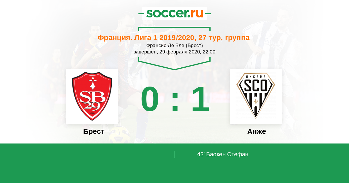 Франция. Лига 1 19.10.2019 Анже Логотип футбольный клуб Анже 0:1 Логотип футбольный клуб Брест Брест