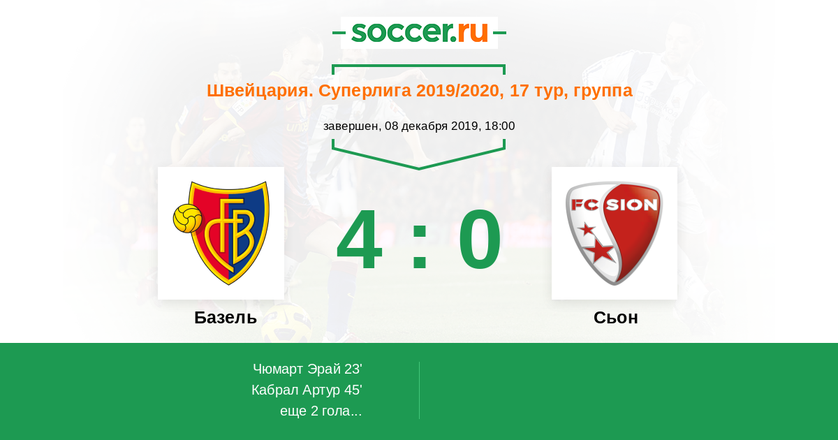 Швейцария. Суперлига 09.12.2020 Базель Логотип футбольный клуб Базель 4:2 Логотип футбольный клуб Сьон Сьон