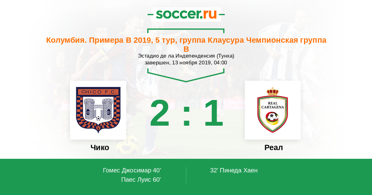 Колумбия. Примера B 25.03.2019 Реал Логотип футбольный клуб Реал (Картахена) 2:1 Логотип футбольный клуб Чико (Тунха) Чико