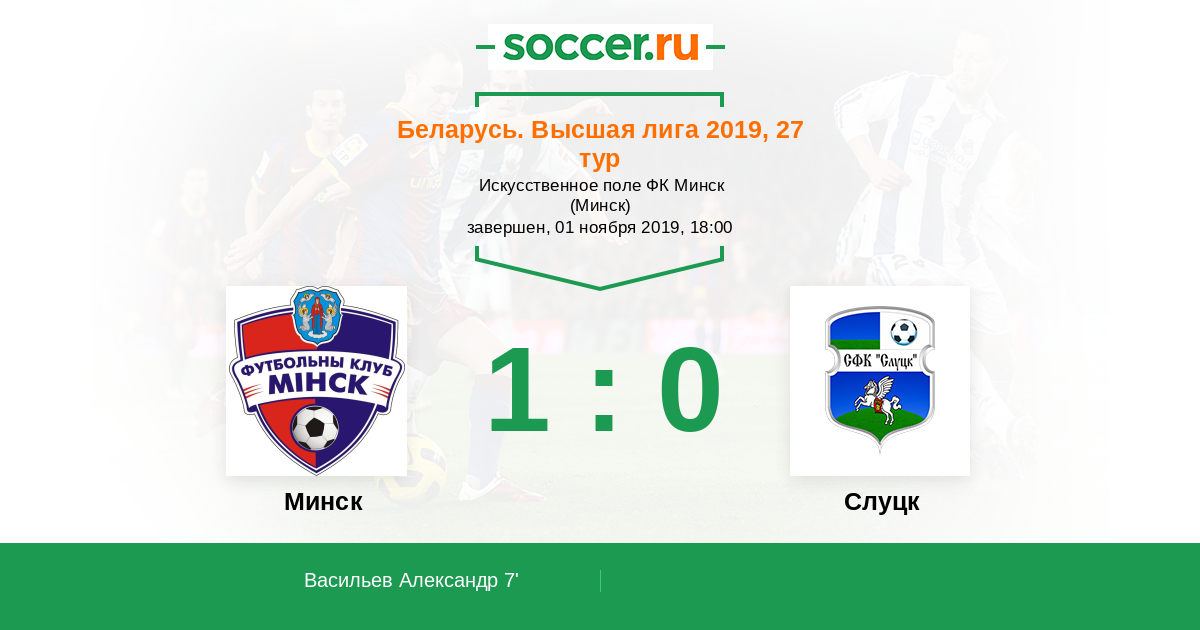 Беларусь. Высшая лига 22.09.2018 Слуцк Логотип футбольный клуб Слуцк 0:1 Логотип футбольный клуб Минск Минск