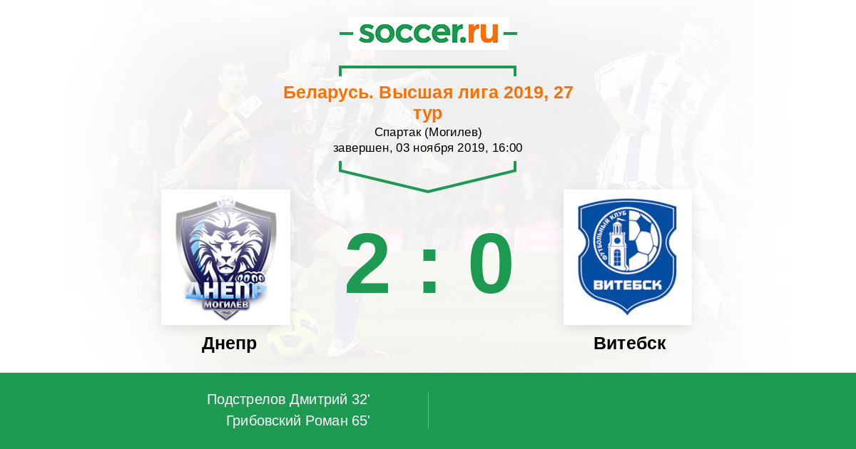 Беларусь. Высшая лига 19.10.2018 Витебск Логотип футбольный клуб Витебск 3:1 Логотип футбольный клуб Днепр (Могилев) Днепр