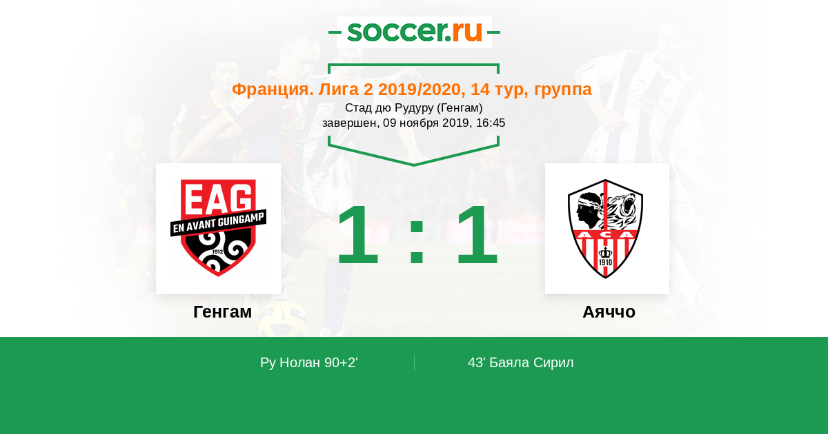 Франция. Лига 2 23.11.2020 Генгам Логотип футбольный клуб Генгам 2:2 Логотип футбольный клуб Аяччо Аяччо