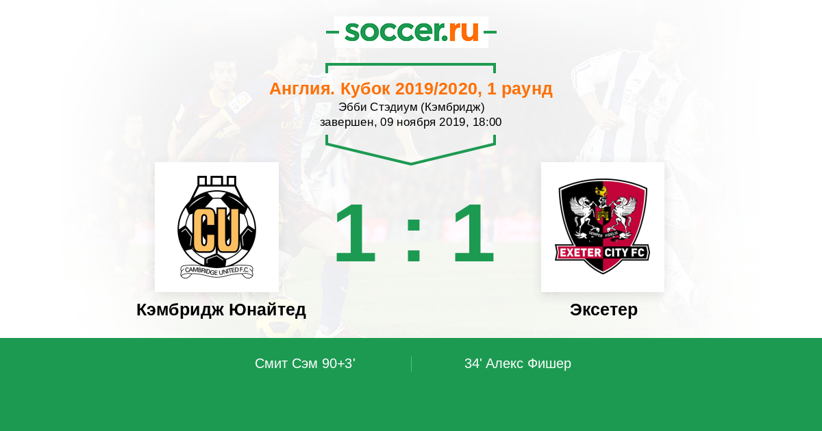 Англия. Кубок 19.11.2019 Эксетер Логотип футбольный клуб Эксетер 1:0 Логотип футбольный клуб Кэмбридж Юнайтед Кэмбридж Юнайтед