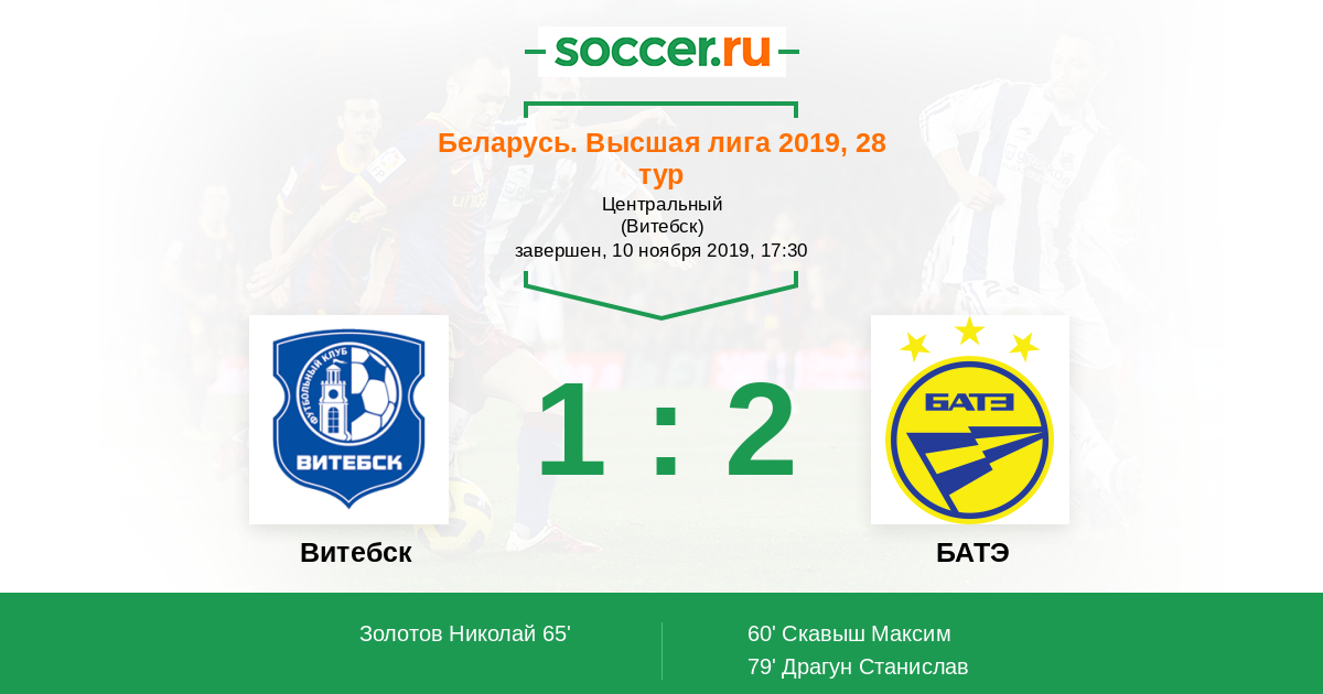 Беларусь. Высшая лига 19.11.2016 Витебск Логотип футбольный клуб Витебск 2:1 Логотип футбольный клуб БАТЭ (Борисов) БАТЭ