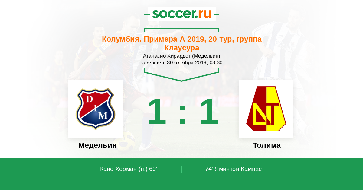 Колумбия. Примера А 24.01.2020 Толима Логотип футбольный клуб Толима (Ибаге) 2:2 Логотип футбольный клуб Медельин Медельин