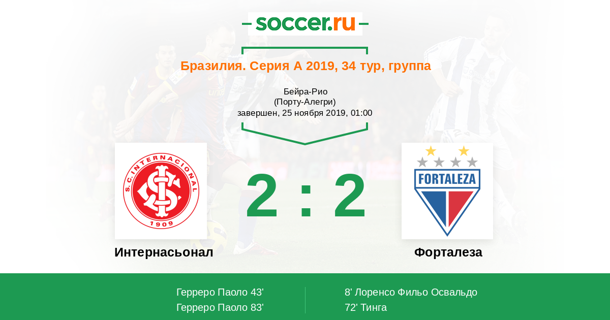 Бразилия. Серия А 18.04.2022 Интернасьонал Логотип футбольный клуб Интернасьонал (Порту-Алегри) 2:1 Логотип футбольный клуб Форталеза Форталеза