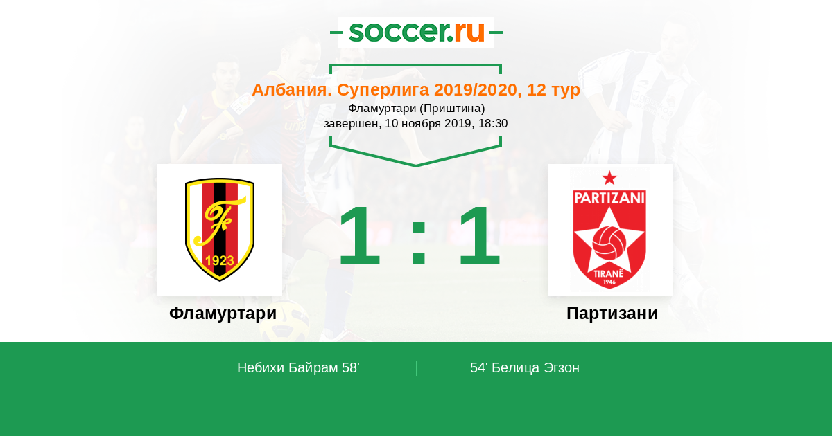Албания. Суперлига 23.11.2018 Фламуртари Логотип футбольный клуб Фламуртари (Влера) 1:0 Логотип футбольный клуб Партизани (Тирана) Партизани