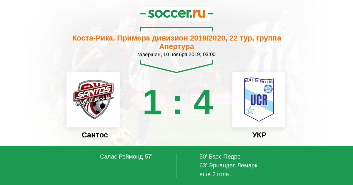 Коста-Рика. Примера дивизион 05.04.2015 УКР Логотип футбольный клуб УКР (Сан Хосе) 0:1 Логотип футбольный клуб Сантос (Гуапилес) Сантос