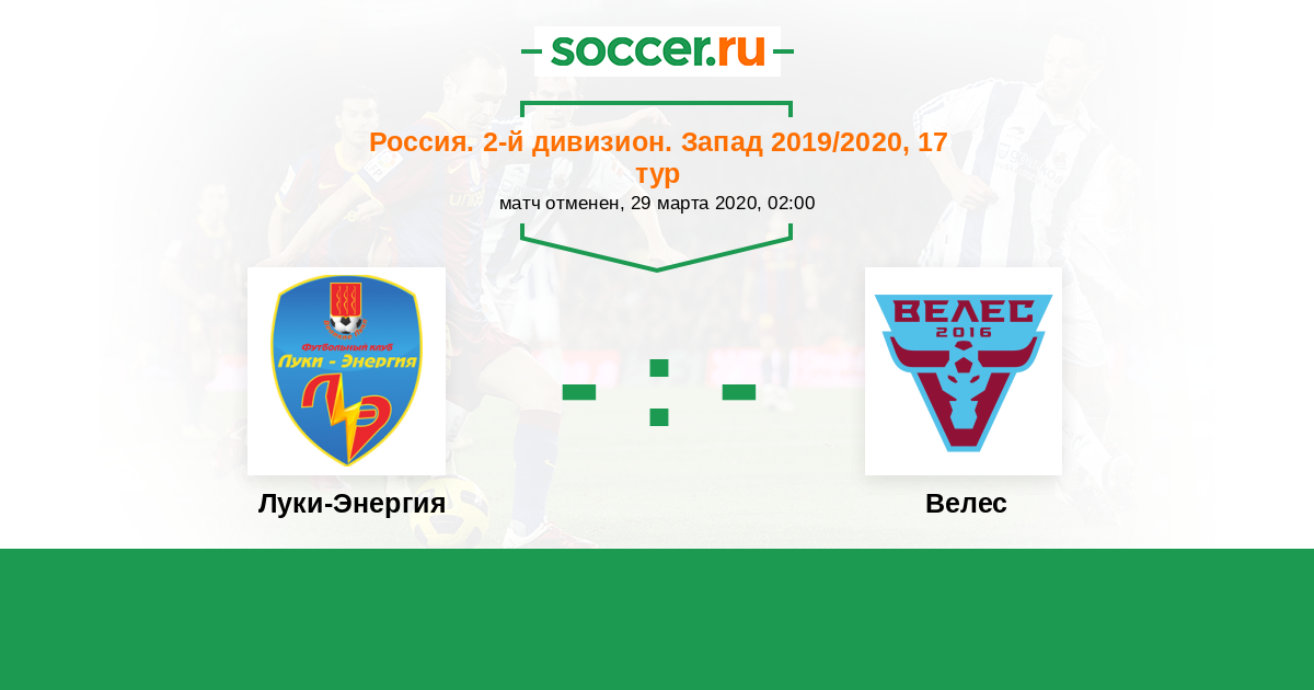 Россия. Вторая лига. Группа 2 28.10.2017 Велес Логотип футбольный клуб Велес (Москва) 2:1 Логотип футбольный клуб Луки-Энергия (Великие Луки) Луки-Энергия