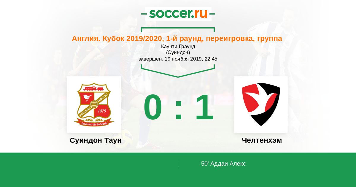 Англия. Кубок 09.11.2019 Челтенхэм Логотип футбольный клуб Челтенхэм 1:1 Логотип футбольный клуб Суиндон Таун Суиндон Таун