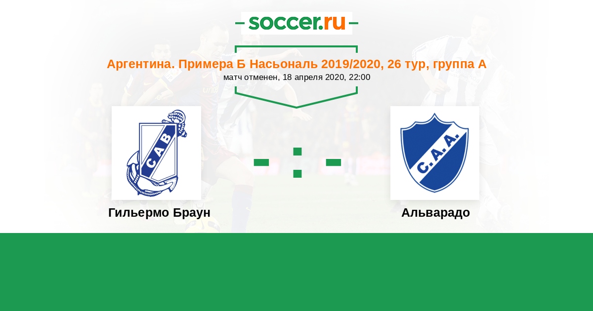 Аргентина. Примера Б Насьональ 29.11.2020 Альварадо Логотип футбольный клуб Альварадо (Мар-дель-Плата) 0:0 Логотип футбольный клуб Гильермо Браун (Пуэрто-Мадрин) Гильермо Браун