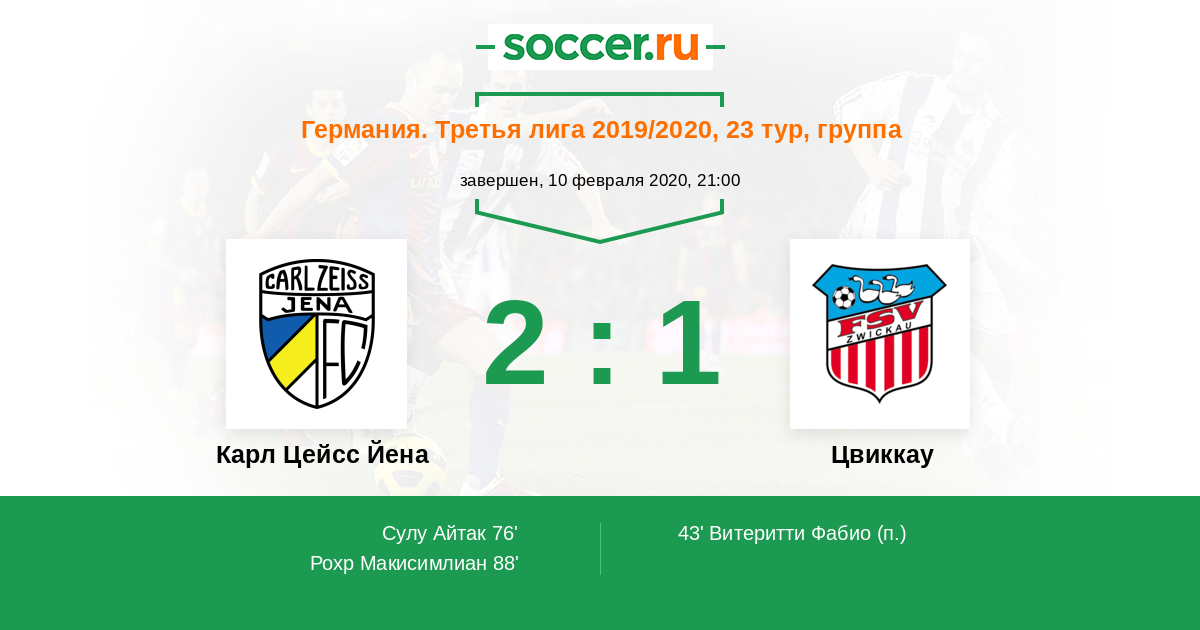 Германия. Третья лига 17.02.2019 Цвиккау Логотип футбольный клуб Цвиккау 2:0 Логотип футбольный клуб Карл Цейсс Йена Карл Цейсс Йена