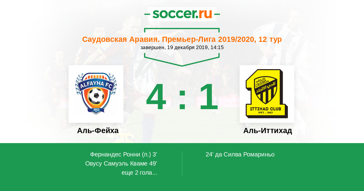 Саудовская Аравия. Премьер-Лига 24.08.2020 Аль-Иттихад Логотип футбольный клуб Аль-Иттихад (Джидда) 4:1 Логотип футбольный клуб Аль-Фейха (Аль-Маджмаа) Аль-Фейха