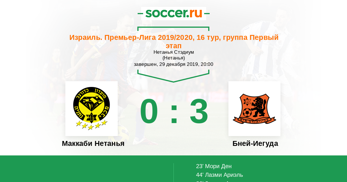 Израиль. Премьер-Лига 16.01.2016 Маккаби Нетанья Логотип футбольный клуб Маккаби Нетанья 0:2 Логотип футбольный клуб Бней-Иегуда (Тель-Авив) Бней-Иегуда