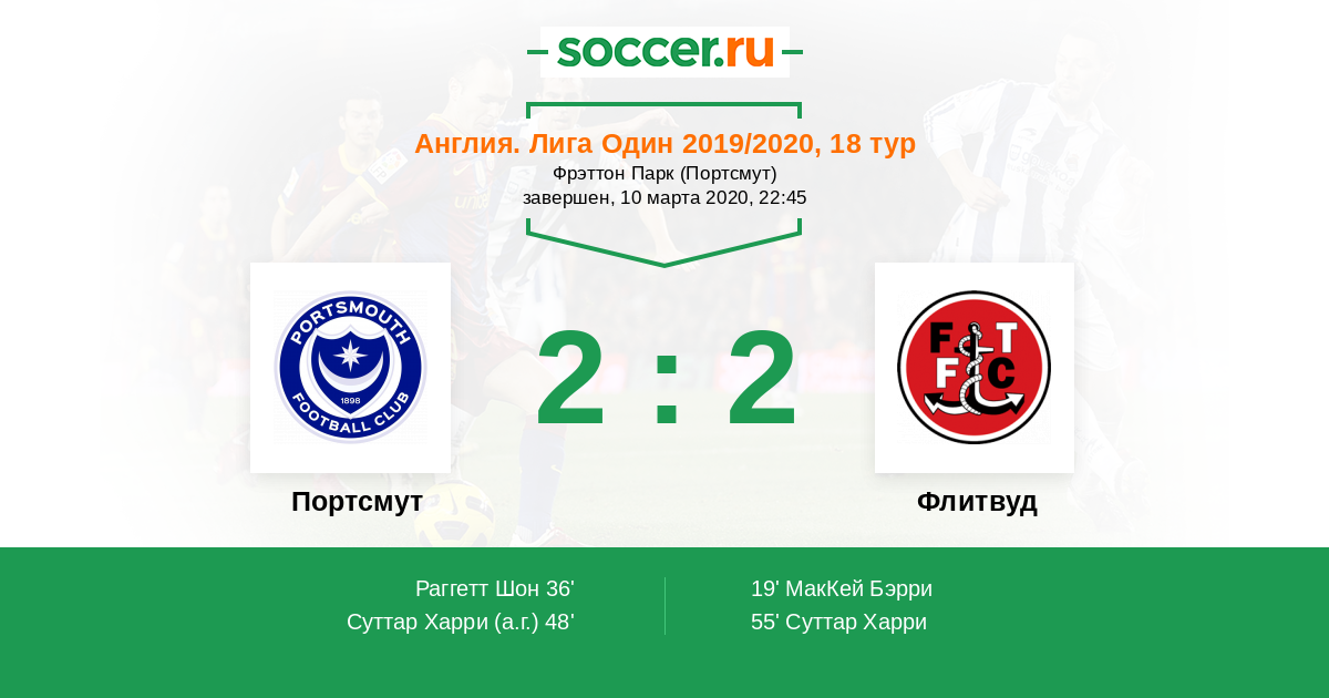 Англия. Первая Футбольная Лига 20.10.2018 Портсмут Логотип футбольный клуб Портсмут 1:0 Логотип футбольный клуб Флитвуд Флитвуд