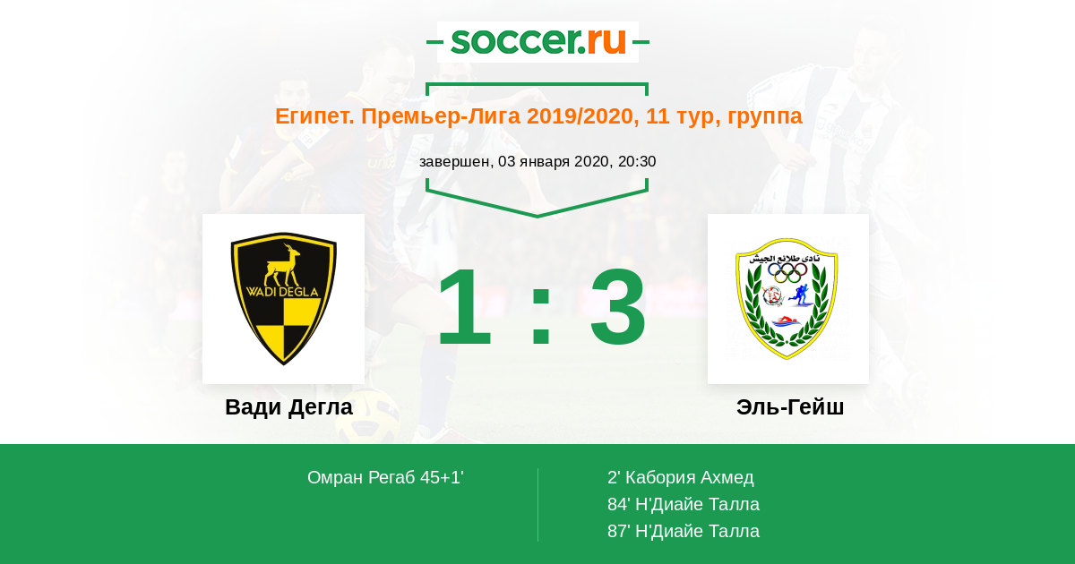 Египет. Премьер-Лига 13.02.2014 Эль-Гейш Логотип футбольный клуб Эль-Гейш (Каир) 2:4 Логотип футбольный клуб Вади Дегла (Каир) Вади Дегла