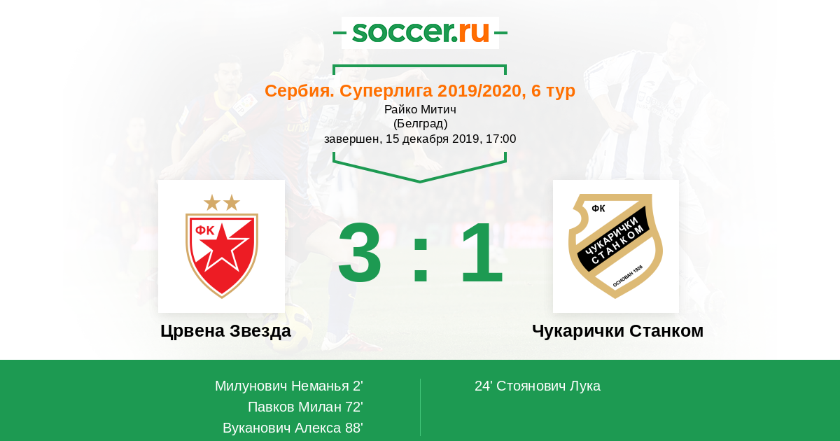 Сербия. Суперлига 06.08.2017 Црвена Звезда Логотип футбольный клуб Црвена Звезда (Белград) 3:0 Логотип футбольный клуб Чукарички Станком (Белград) Чукарички Станком