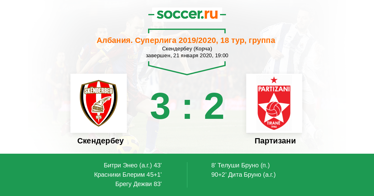 Албания. Суперлига 16.01.2021 Скендербеу Логотип футбольный клуб Скендербеу (Корча) 1:2 Логотип футбольный клуб Партизани (Тирана) Партизани