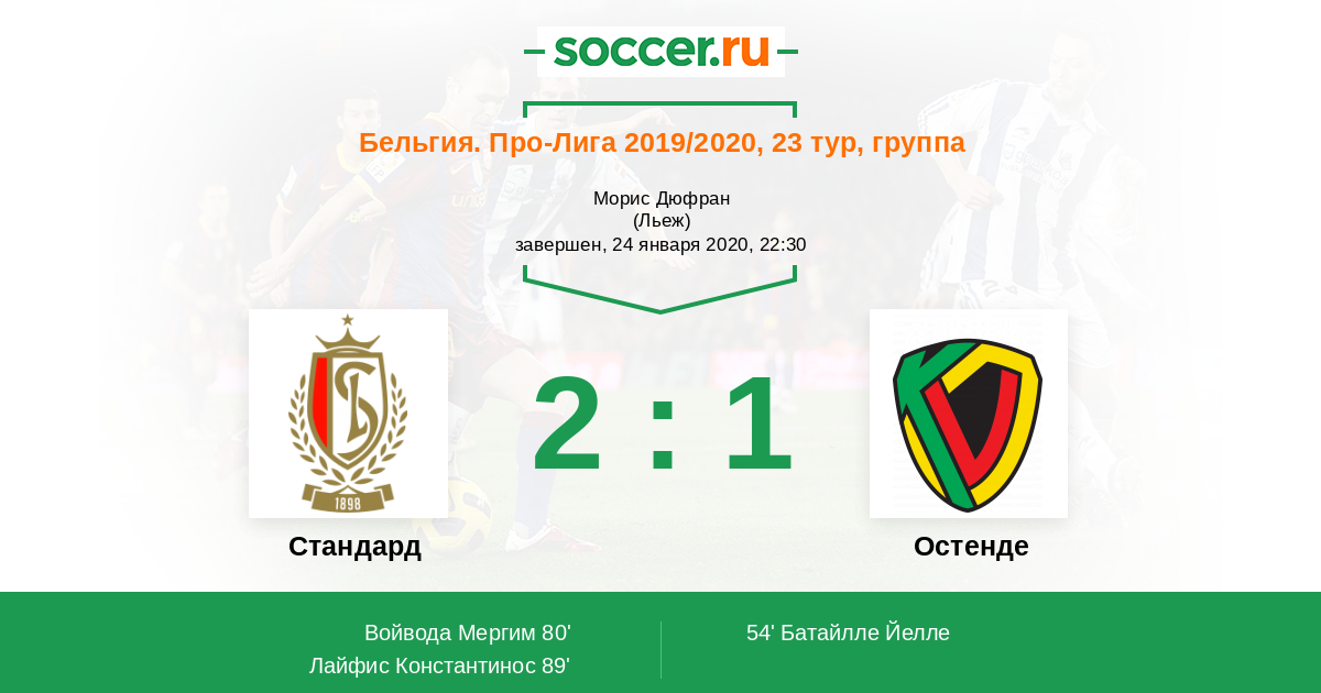 Бельгия. Про-Лига 23.11.2014 Остенде Логотип футбольный клуб Остенде 3:2 Логотип футбольный клуб Стандард (Льеж) Стандард