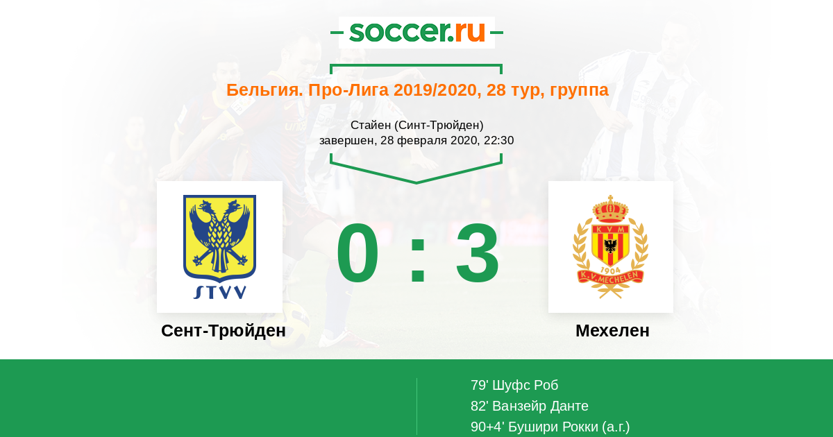 Бельгия. Про-Лига 30.10.2019 Мехелен Логотип футбольный клуб Мехелен 1:2 Логотип футбольный клуб Сент-Трюйден (Синт-Трёйден) Сент-Трюйден