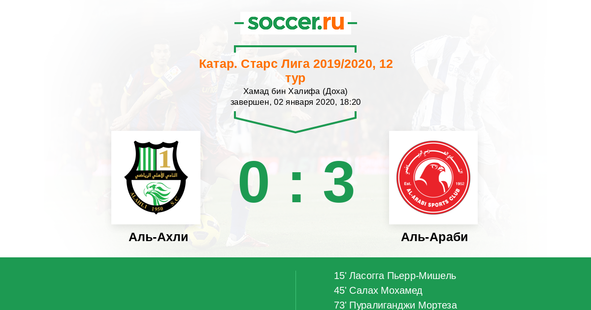 Катар. Старс Лига 10.02.2018 Аль-Араби Логотип футбольный клуб Аль-Араби (Доха) 0:4 Логотип футбольный клуб Аль-Ахли (Доха) Аль-Ахли
