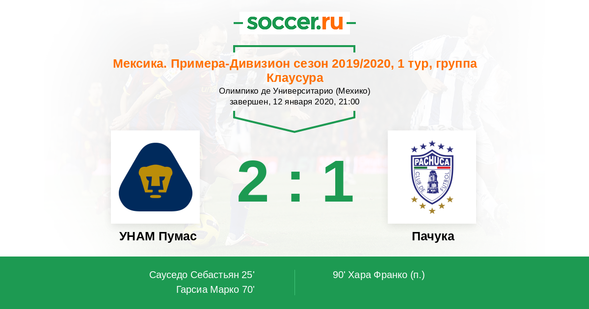 Мексика. Примера-Дивизион 27.01.2019 Пачука Логотип футбольный клуб Пачука 1:0 Логотип футбольный клуб УНАМ Пумас (Мехико) УНАМ Пумас