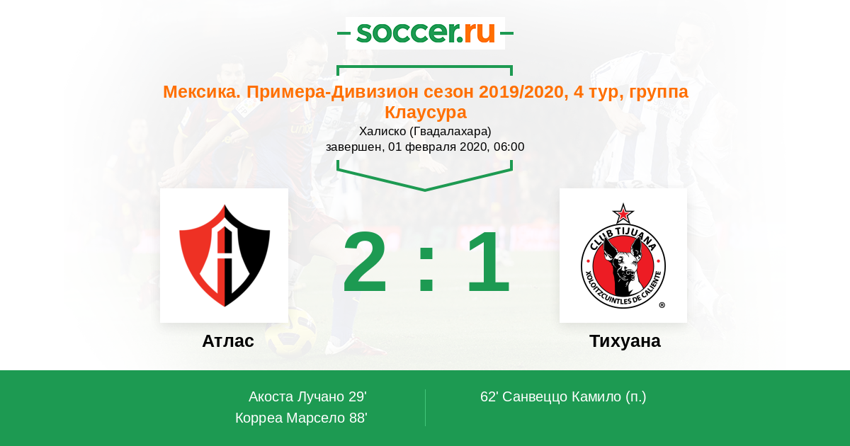 Мексика. Примера-Дивизион 04.04.2021 Атлас Логотип футбольный клуб Атлас (Гвадалахара) 1:0 Логотип футбольный клуб Тихуана Тихуана