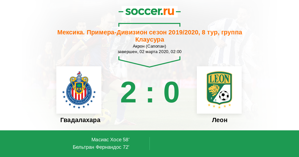Мексика. Примера-Дивизион 20.02.2022 Леон Логотип футбольный клуб Леон 2:1 Логотип футбольный клуб Гвадалахара Гвадалахара