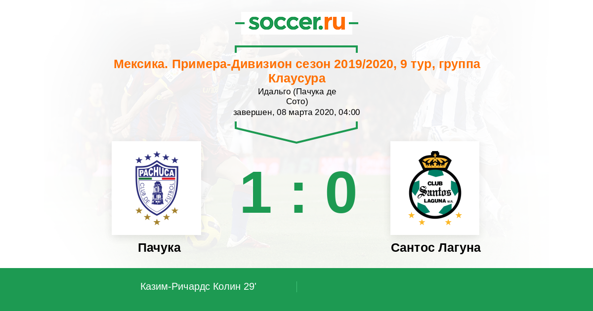 Мексика. Примера-Дивизион 16.10.2016 Пачука Логотип футбольный клуб Пачука 3:0 Логотип футбольный клуб Сантос Лагуна (Торреон) Сантос Лагуна