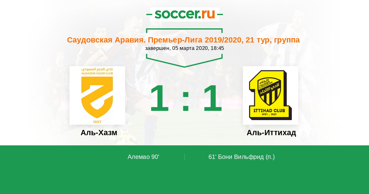 Саудовская Аравия. Премьер-Лига 18.03.2022 Аль-Иттихад Логотип футбольный клуб Аль-Иттихад (Джидда) 3:0 Логотип футбольный клуб Аль-Хазм (Эр-Расс) Аль-Хазм