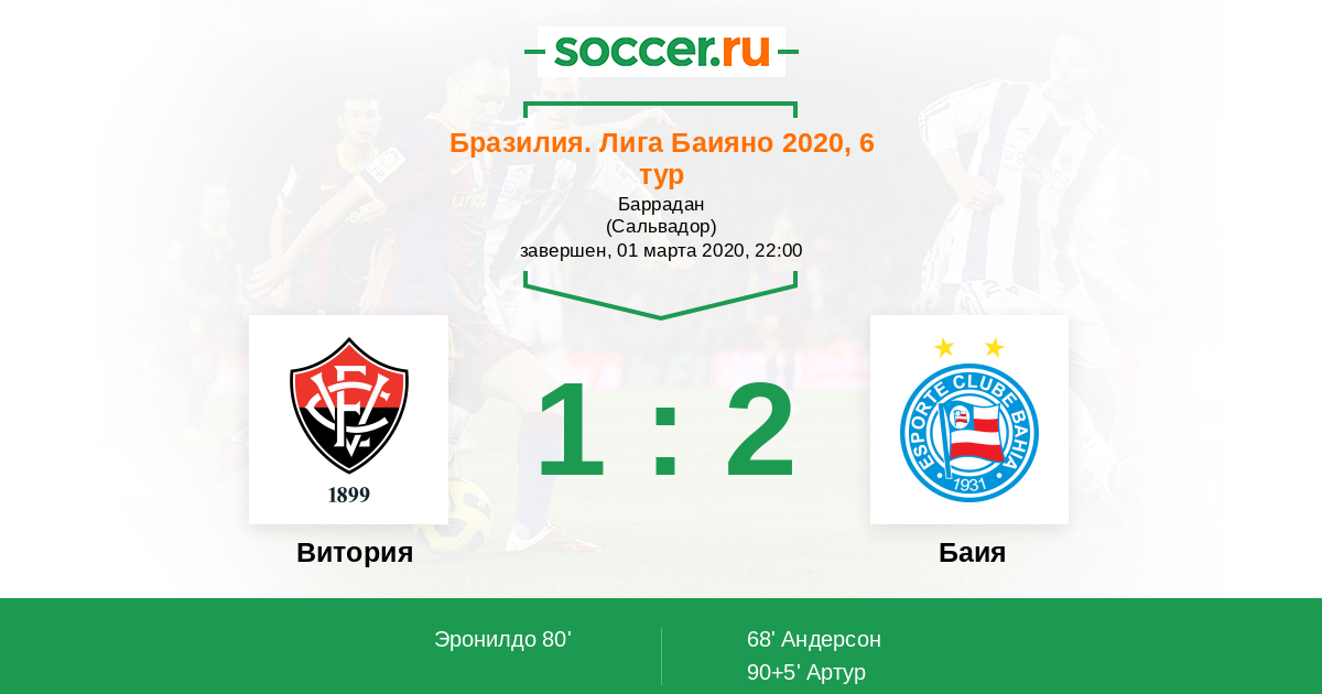 Бразилия. Лига Баияно 01.04.2018 Баия Логотип футбольный клуб Баия (Салвадор) 2:1 Логотип футбольный клуб Витория (Сальвадор) Витория