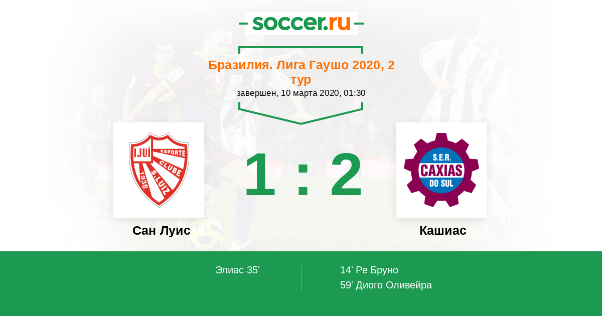 Бразилия. Лига Гаушо 04.04.2010 Сан Луис Логотип футбольный клуб Сан Луис 0:2 Логотип футбольный клуб Кашиас (Кашиас-ду-Сул) Кашиас