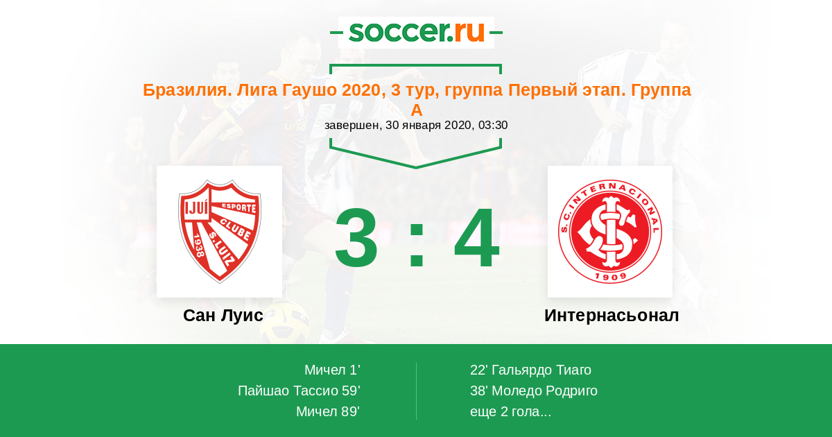 Бразилия. Лига Гаушо 09.02.2026 Интернасьонал Логотип футбольный клуб Интернасьонал (Порту-Алегри) 3:1 Логотип футбольный клуб Сан Луис Сан Луис