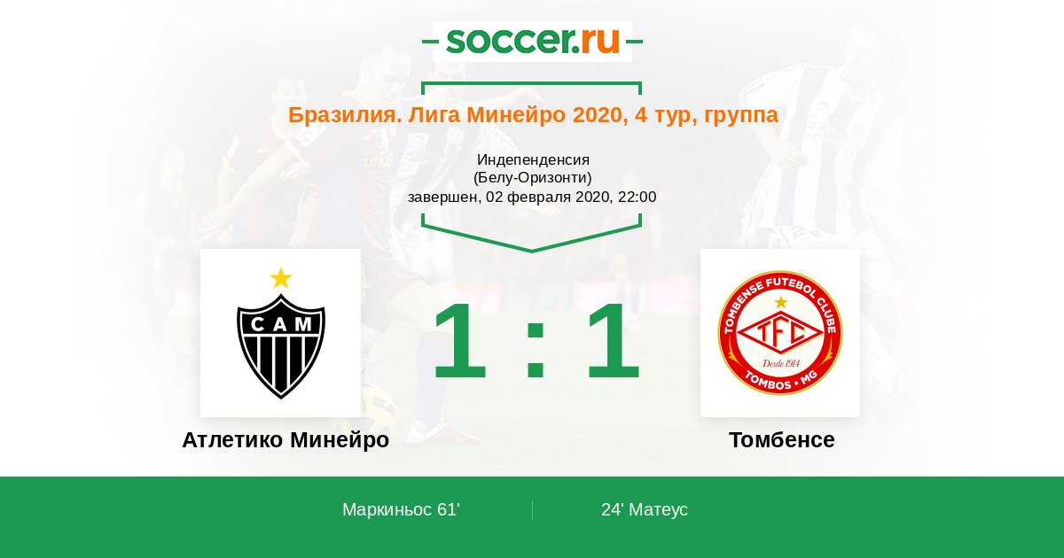 Бразилия. Лига Минейро 27.08.2020 Атлетико Минейро Логотип футбольный клуб Атлетико Минейро (Белу-Оризонти) 2:1 Логотип футбольный клуб Томбенсе (Томбус) Томбенсе