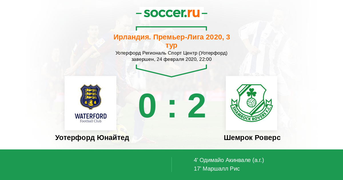 Ирландия. Премьер-лига 23.03.2018 Уотерфорд Юнайтед Логотип футбольный клуб Уотерфорд Юнайтед 2:1 Логотип футбольный клуб Шемрок Роверс (Дублин) Шемрок Роверс