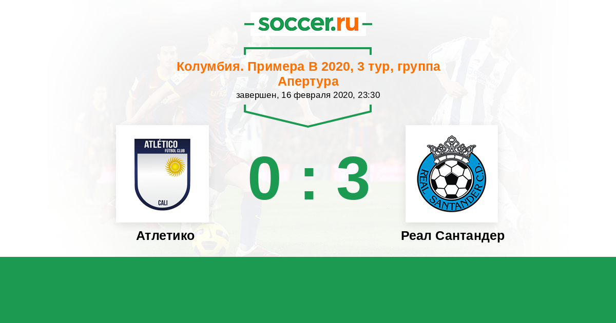 Колумбия. Примера B 25.02.2017 Атлетико Кали Логотип футбольный клуб Атлетико Кали 0:2 Логотип футбольный клуб Реал Сантандер (Букараманга) Реал Сантандер